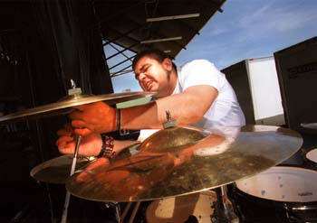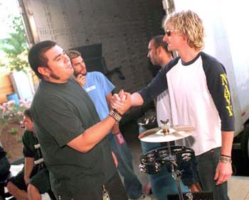 Double Ace: P-Roach drummer Dave Buckner shakes hands with drummer and former Willow Glenite Eric Kretz of Stone Temple Pilots, which headlined the show. Both bands are scheduled to perform at BFD on Friday (June 16) at Shoreline Amphitheatre.