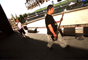 Vocalist Coby Dick and bassist Tobin Esperance check out the view from the stage of the brand-new Sacramento Valley Amphitheatre during sound check.
