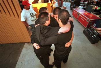 Huddle Up: Papa Roach does its ritual hug seconds before hitting the stage.