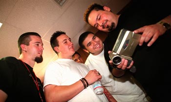 Instant Replay: Guitarist Jerry Horton, vocalist Coby Dick and drummer Dave Buckner crowd around their manager from San Jose, Gary Avila, to watch footage of a video of themselves that they're sending to a friend.