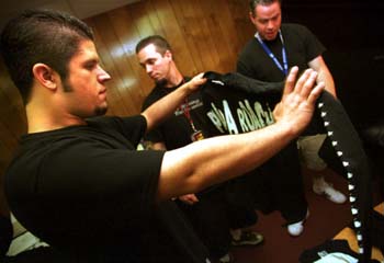 T-Off: Shortly after arriving at the venue for their recent Sacramento show, bassist Tobin Esperance checks out the freshly minted P-Roach merchandise while guitarist Jerry Horton and manager Bret Bair stand by.