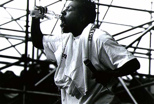 Water, Water, Everywhere: Wyclef of the Fugees cools off in the middle of their set. (40k)