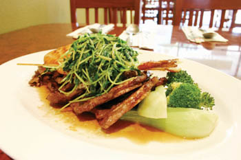 While the restaurant doesn't have tabletop grills, grilled meats play a starring role. Grilled short ribs ($10.50) are thick and juicy but sauced a little thin. I would have preferred a thicker marinade and a deeper, more caramelized finish. The spicy mixed grill ($12.50) is better and combines expertly grilled salmon, pork, chicken and shrimp. It's all lightly bathed in a spicy, slightly sweet sauce. Both dishes are topped with fresh sautéed pea shoots, a nice touch that adds a flavorful splash of color.