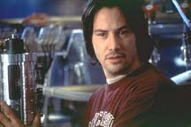 He's employed in a university lab on Chicago's South Side, tooling the instruments that will help the lab team achieve cold fusion--stabilizing a bubbling glass tank of water that will produce cold fusion, hydrogen gas or "sonoluminescence"; the details are vague. The team celebrates their success with champagne--indecently early, I thought--and our Keanu is escorting home a drunken British scientist, Lily Sinclair (Rachel Weisz, picked, no doubt, so that she wouldn't upstage Keanu with her talent). He returns for his motorcycle just as the whole laboratory goes up in a sizable explosion.