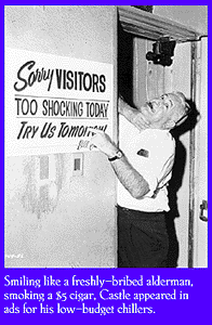 Most accounts track Castle's great promotions as beginning with Macabre (1959). It should be noted, though, (and Castle did) that as a young theatrical producer, he painted swastikas on a Connecticut theater he was renting, to convince the press that he'd been vandalized by fascists who didn't want the public to see his play. (Naturally, a proudly anti-fascist throng turned up that night in support.) Castle might have been a little unscrupulous. One of his screenwriters, not a fan, remembered that Castle always used to call himself "The Earl of Deferral." ("Deferral" is a movie financing practice that means delaying costs to the last minute and beyond.) Still, you could never fault him for lacking a sense of drama.