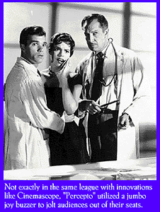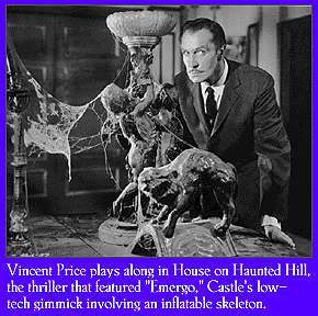 Smiling like a freshly-bribed alderman, smoking a $5 cigar and making egregious puns about the movies at hand, Castle began to appear in pre-title sequences and advertisements. for his films, deploying a rainbow of inspired gimmicks to sell them. The House on Haunted Hill (1960) (Frank Lloyd Wright's landmark Ennis House played the title role) was a story of various ne'er-do-wells spending a night in a haunted mansion for cash; the movie comes to a complete stop in a pool of acid in the basement, from which a skeleton emerges to menace the living. Vincent Price never looked less interested, but "Emergo," Castle's trick of sending an inflatable skeleton floating down into the crowd on a guy-wire, drew in both the curious and the amateur pea-shooter marksman. Price perked up for Castle's next work, The Tingler, a much more wild tale about a critter that lives in the spinal chord. This beast, "The Tingler" can only be laid to rest by a good, loud scream. The Tingler sports an LSD sequence, as well as a sudden burst of color amidst the black and white, in honor of Hitchcock's ending to Spellbound. To aid the surprise, Castle had installed "Percepto!", a jumbo joy-buzzer that jolted audiences out of their seats at key moments. The Tingler has the mark of Castle at his best: a berserk, dead-serious plot and a gritty willingness to give the audience a good shock, one way or another.