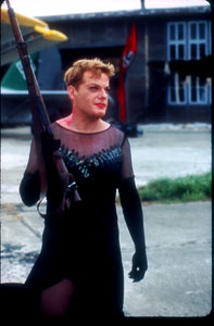 Back when Eddie Izzard was bruited about as England's funniest performer, he began to make movies (The Avengers, The Cat's Meow) without making an impression. So then came the rejoinder, "Well, you ought to see him in a dress." Here he is in a dress, doing two songs, one of which is Dietrich and the other isn't. Again, whatever there is that gives Izzard his rep is not to be seen onscreen. Cosmo has an affecting parting scene with his wife, before he leaves on this mission; but though we start to care about him, he's put through physical comedy that's like a species of elder abuse. Screenwriters David Schnieder and Stanford grad Jeff Stockwell can't give this wandering tale any wit, so they add violence and would-be heartwarming scenes, such as an annoying orphan that grabs Archie and won't let go. The director Stefan Ruzowitzky is unclear on the concept, as well. All that can be added is that All the Queen's Men could have used a cameo by Hitler, who, fans of The Simpsons will remember, was once fooled by Grandpa Abe in a dress and black fishnet stockings. "Das ist ein fake boobie!" the Fuhrer shrieked, discovering the ruse.