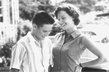 Mol's graciousness makes her part of the film a pleasure. Her soft reactions to a very schmaltzy bit of dialogue delivered by Lenny takes some of the bosh out of the lines. Lenny tells a story of his late father, a shoe salesman who felt there was poetry in his job, just knowing that his customers were going to see the world wearing his shoes. (Unbidden, a bit of Eric Idle popped into my mind, from Monty Python's The Meaning of Life--the scene in which Idle, as a French waiter, tells of how his mother urged him into the restaurant business. She said he could bring a little bit of happiness into the world by serving food; his unseen listener's amused contempt makes Idle mutter, "I admit, it isn't much of a philosophy.") Hedy handles this boy/man Lenny like a child psychologist--she's a dream of a sophisticated older woman in the same way Phil is a dream of an uncle. Nothing is otherworldly about her; nothing is hidden. When Lenny spies on Hedy's bedroom through the louvers of her closet, one remembers the similar scene in Blue Velvet: Lynch's masterpiece had its power because it addressed the mysterious, frightening quality of sex first glimpsed.