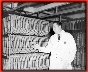 Across the way the smokers for franks and other cooked sausages await us. Morrison is framed by thousands of links draped around hangers, waiting their turn in the heated rooms. "The smoking is an exact science, too," he says. "You don't just cram 'em in and turn on the heat. You start at one temperature then move to another. If you do 10 minutes over or under, you ruin the whole batch."