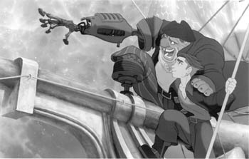 The book still reads easily, so the problem is onscreen. First, it's not a unique spin on the familiar tale. Anthony Quinn starred in an outer-space Treasure Island for Italian television in 1987. Second, the gag writing is strained--the various causes and effects of how jokes work are lost, and Treasure Planet spends a lot of time trying to milk cuteness out of gags that have dropped dead of anemia. Third, the characterizations are uninspired. Hawkins is updated to the personality of a skateboard-riding delinquent in the hopes of nailing that 12-18 demographic (good luck). Emma Thompson gives her first-ever disagreeable performance as the voice of a female cat-woman who captains the Hispanola. She is so irritatingly chipper, I'd swear it was actually Julie Andrews.