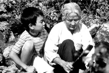 MY GRANDMOTHER Jodelle Simpson Murphy was the noblest woman who ever walked the earth. Nevertheless, The Way Home (a.k.a. Jibuero) didn't liquefy me, despite the film's honorable dedication "to all grandmothers," as well as its shameless-to-the-point-of-D.-W.-Griffith use of (grand)maternal sacrifice. One sample: the old woman (Eul-Boon Kim), bent to a 90-degree angle by osteoporosis, trudging out in the rain to fetch a meal for her ungrateful grandchild Sang-woo (Seung-Ho Yoo). Oh, but there's more. Take, for instance, the part where she decides to walk home, a mere matter of about 10 miles, having spent her bus fare on the kid to buy him a Choco-Pie. The film is just that relentless. This wholesome fare might work on susceptible types, maybe as a story for a child or to teach us all a lesson about the way Western crapola is inundating the traditional country-folk way of life. Either way, the film inspires guilt (and my sainted grandmother hated guilt worse than she hated dirt).