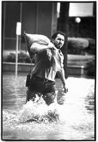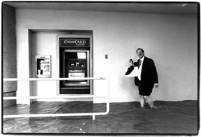 Aqua Velva: Rick Swarts wonders where to find hipwaders that won't clash with his tie during the March flooding in downtown San Jose.