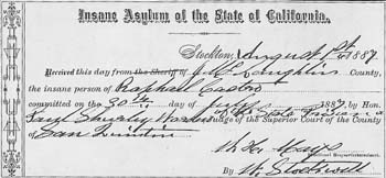 Final Outcome: Raphael Castro's commitment papers to the Stockton Insane Asylum.