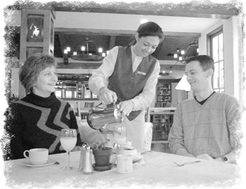 The house-cured gravlax is a riot of piquant flavors: slices of slightly oily black pepper-edged salmon topping half a bagel, plus capers, red onion, tomato, zesty watercress, and diced potato salad with feathery fresh fennel. And the excellent SMI eggs Benedict features poached eggs, Canadian bacon, lemon hollandaise, sautéed "morning" potatoes, and wonderful cornbread instead of English muffins. Desserts include two slices of rich Valrhona chocolate cake, caramel sauce, dried cherries, and a puff of cream; and a luscious maple crème brûlée, a beautiful silky cool custard with walnuts.