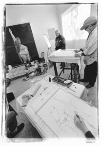 Suddenly, a pencil-wielding artist--and she's literally surrounded by them at the moment--cracks a joke: "All that grass sticking up around you doesn't look quite right," he says. "So I'm turning the grass into flames."