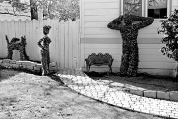 On the west side of Petaluma, surrounded by sweet little houses, there's an especially sweet little house that is host to a small group of bushmen. Well, one bushman, actually. And a bush woman. And a bush dog. Yes, the house at 333 Keokuk sports a jolly green triumvirate of charming topiary people. Lush and leafy, cleverly designed and well-trimmed, they are marvelous arboreal creations that pretty much scream the word "whimsy." The woman, tall and improbably busty, stands on the lawn next to a pointy-edged topiary doggie as the naughty man stands up against the house, his back to the street, peering through the living-room window. I can't imagine what he's looking for; the big show is clearly out in the front yard. --D.T.