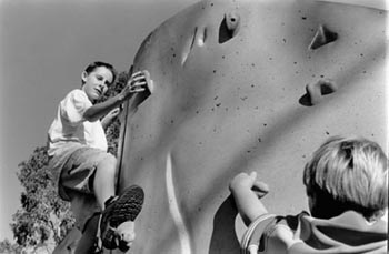 Climbing the wall: Nikos Laub, left, and friend kick up their heels on the Howarth Park climbing wall in Santa Rosa.