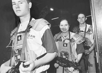 Q--ZAR, IN ROHNERT PARK, is a scary place. Hyperventilating teens, strapped to the pituitaries with plastic armor and armed to the teeth with noise-making laser weapons, crawl and clamber through a black-light maze, stalking one another as loud, vaguely futuristic rock music pounds its way through their ears and straight into the cerebral cortex. Once their prey is located, a sonic blast from their guns, if the aim is true, causes a jarring vibration that runs all through the victim's chest-plate. Take that! You're out! Teens, it seems, have a practiced advantage over their elders, but with a bit of repetition, parents can become laser warriors as skilled as their own progeny. Did we say Q-zar is scary? Wait till the grown-ups discover it. This may get a whole lot scarier. 6591 Commerce Blvd., Rohnert Park. 588-8100.--D.T