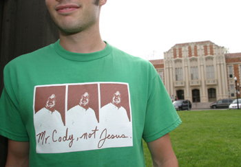 Strange T-shirts have started popping up around Santa Rosa High School lately, featuring a teacher's portrait in triplicate and a cryptic, bumper-sticker-like slogan: "Mr. Cody, not Jesus." The words, written in a soft schoolgirl cursive, dance across the chest, while three smiling, mustached Mr. Codys preside with authority from above. The bizarre juxtaposition is most effective, and the shirts have attained a campus-wide popularity of "Vote for Pedro" proportions. But what the hell do they mean? "The thing is, it can be easily misconstrued," explains the shirts' designer, former SRHS student Audrey Hope. "But, you know," she adds, "I like that." Naturally, "Mr. Cody, not Jesus" sounds like an exhortation to deny one's love of Jesus Christ and subsequently transfer all worship to Mr. Cody, who teaches economics at Santa Rosa High School. From all accounts, Mr. Cody seems like an amazing guy. His students speak mythically of the "Mr. Cody style," of his tendency to ramble on about "funny, weird things." In fact, he sounds a lot like Jesus was in his day, and though I have never met Mr. Cody, the notion of worshipping him because a T-shirt tells me to seems sensible enough. The truth is that the phrase sprung from the flourish of Mr. Cody's unique classroom discipline. During their senior year, Hope and her friends latched on to a particular quirk about Mr. Cody, who swiftly reprimanded students whenever they took the Lord's name in vain. "No, no," comes the now-famous correction, "my name is Mr. Cody, not Jesus." Hope's first run of T-shirts sold out so quickly that she had to take advance orders for another batch. All told, she sold over 50 of them before graduating and moving to Boston for college. She's glad to hear that most of those 50 shirts are still seen at school and around town, but Hope remembers one customer who bought a shirt from her and then never wore it: Mr. Cody. "I'd like to ask him what he ever did with his shirt," she wonders from her new East Coast home. "Maybe his wife wears it to bed or something."--G.M.