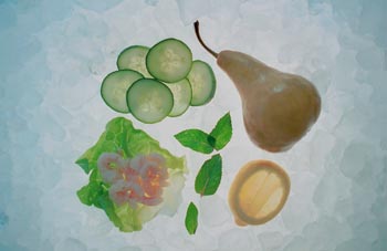 Accordingly, Fiszer makes lavish use of fresh herbs in the summer, basil and mint being favorites that quickly transcend garnish and become primary ingredients. The chapter on cold soups in Fiszer's Good Day for Soup (which she co-wrote with Jeannette Ferrary in 1996), is full of herbs. Dilled cucumber soup with bay shrimp. Cool minted pea soup. Cream of mixed lettuces, chive, and chervil. Chilled pear and parsley. Cold plum and watercress.