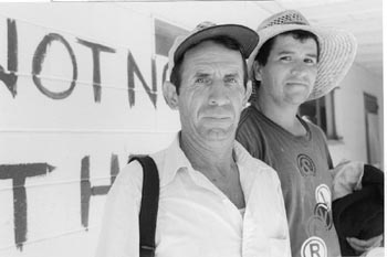 Sign of the times: Laborers Miguel Zepeda and Ruben Renteria stand in front of a sign spray-painted in protest over
