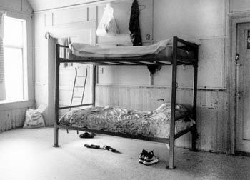 I AM STANDING beside four six-foot-high locked gym lockers, near the doorway of a small room holding four single beds. Pieces of carpet, some red, some blue, cover parts of the gray-painted concrete slab floor. There is a microwave oven at the foot of one bed, a television set between two others, a Sony stereo stack beside another.