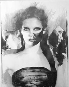 Of course, one man's ode is another man's beaver shot. Nick Bennett's composite photography work gleefully combines the influences of David Hockney, Salvador Dali, and Hustler Magazine's Larry Flynt. In one large and dramatic untitled piece, the model is gazing into the camera with her legs spread and her aroused womanhood highlighted with moist fingers. The in-your-face nature of the work has a powerful effect. Bennett of Middletown seems joyous about pushing the ultimate female button.