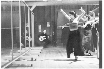 Elena Santonja is standing outside instructing an afternoon palmas (hand-clapping) class. Various insects are dive bombing her: an enormous dragonfly, a buzzing band of mosquitoes, and a large, venomous-looking red-winged bug. She leaps gracefully up onto a tree stump, clapping her hands around her face, her eyes wide. "I don' wanna die in the forest!" she wails comically from her wooden pedestal. "I wanna go back to Madrid."