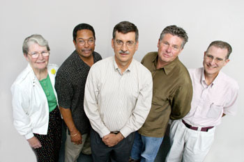 Wage Warriors: Left to Right: Joan Panaro, the Rev. Thomas Kimball, Marty Bennett, Michael Allen, and Bruce Kennedy are fighting the good fight.