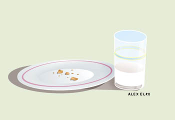 We were alone, just six warm cookies resting on the great plate, which--we quickly noticed--we'd been sharing with a large orange carrot. A carrot? Must have been some kind of mistake. Next to the plate there was a big glass full of milk, and on the table beside the glass was a folded piece of paper, with words scribbled in thick, red crayon.