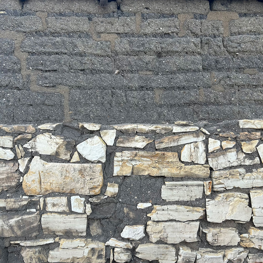 Joanna Keane Lopez pays homage to her New Mexico family, who taught her how to work with adobe mud. “Roadtrip Adobe Theatre of the Bay Area” is a video projection of two adobe panels and shots of Lopez moving around different adobe buildings.